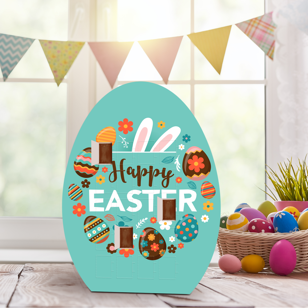 Parfaite alternative à l’œuf de Pâques, ces boîtes de chocolat se présentent sous la forme d’un œuf de Pâques avec 20 petites portes individuelles. Derrière chaque porte se trouvent 20 délicieux chocolats Barry Callebaut, chacun avec les motifs d’une carotte ou du célèbre lapin de Pâques. Avec un support en carton à l’arrière, il permet de placer cet article de toute façon, faisant de chaque endroit une occasion de montrer votre marque ou simplement de montrer un cadeau vraiment excellent.