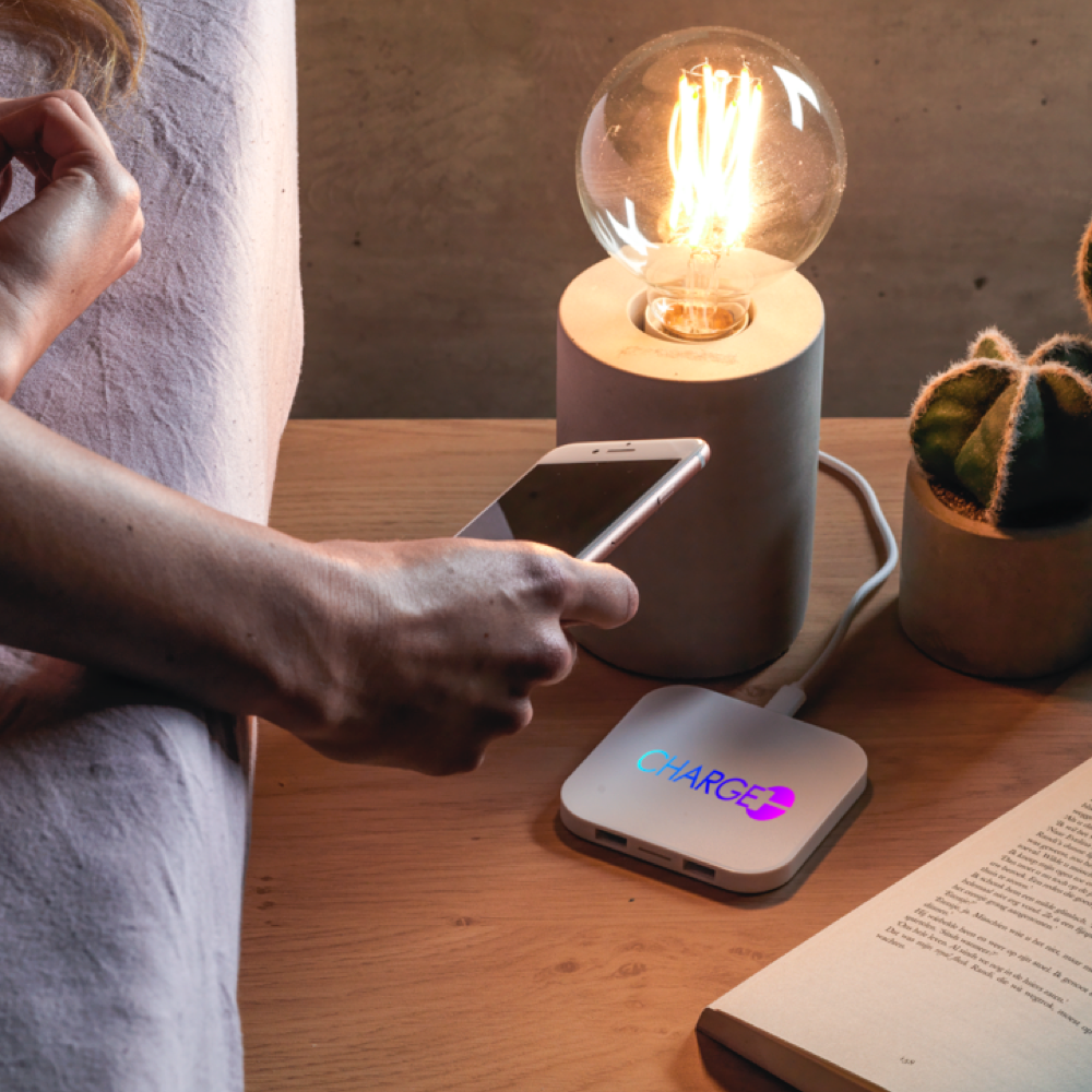 Le chargeur sans fil HUB est pratique et a la possibilité de connecter d’autres appareils grâce aux deux ports USB ! Le chargeur sans fil HUB peut être imprimé avec, par exemple, votre logo ou un autre joli motif. Les options sont infinies ! Faites du chargeur sans fil HUB le cadeau d’affaires idéal et imprimez-le dès maintenant !